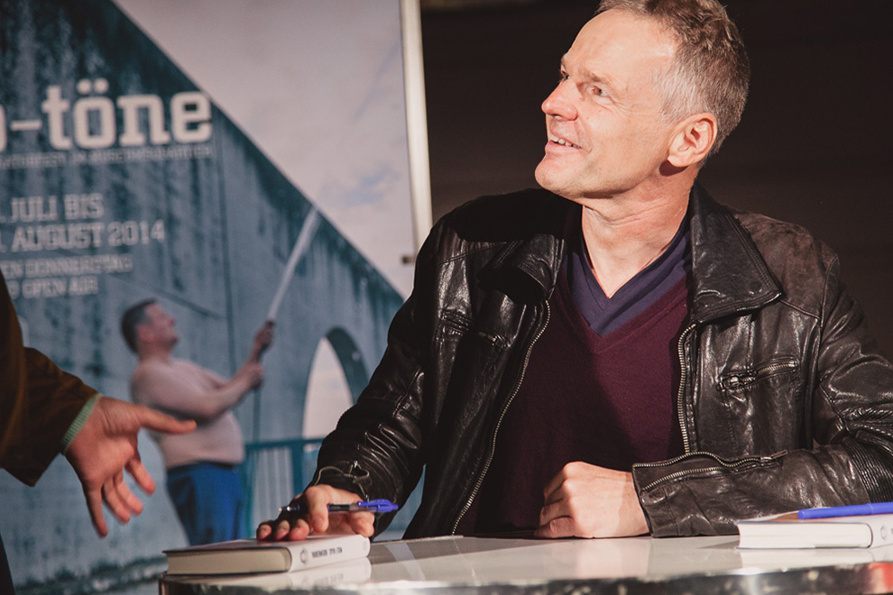 Wolf Haas bei beim Literaturfestival O-Töne 2014 im Wiener Museumsquartier. 11.200 Besucher zählten die insgesamt acht Lesungen, davon allein 3.000 am 28. August im Haupthof des Museumsquatiers als Wolf Haas zum ersten Mal aus seinem Buch “Brennerova” öffentlich las.